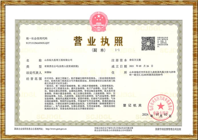 資質(zhì)包括醫(yī)用中心供氧系統(tǒng)、醫(yī)用中心負(fù)壓吸引系統(tǒng)、醫(yī)護(hù)對(duì)講系統(tǒng)、醫(yī)院氧氣管道醫(yī)用氣體工程安裝、醫(yī)療氣體系統(tǒng)工程、醫(yī)院手術(shù)室凈化工程、層流潔凈手術(shù)室裝修、實(shí)驗(yàn)室建設(shè)裝飾凈化工程、無(wú)塵車間凈化工程設(shè)備的生產(chǎn)加工、批發(fā)銷售與安裝施工資質(zhì)(部分資質(zhì)文件未展示,可索取查閱)。