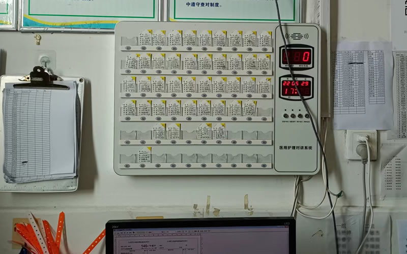每個樓層病區(qū)的護士站安裝一臺呼叫對講系統(tǒng)主機,走廊安裝雙面顯示屏。此款醫(yī)院病房呼叫對講系統(tǒng)為兩芯總線制,護士站主機集系統(tǒng)控制主機、對講電話機、病員一覽卡槽設(shè)計,被廣泛應(yīng)用于鄉(xiāng)鎮(zhèn)衛(wèi)生院護士站病床呼叫對講使用。