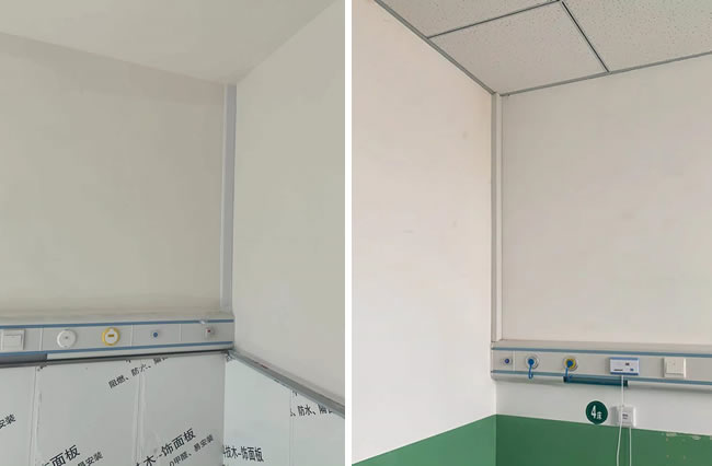 明管加裝飾罩的中心供氧管道安裝方式很好理解,根據(jù)醫(yī)用氣體工程技術(shù)規(guī)范的要求,氣體管道是不允許預(yù)埋到墻里面的,其目的是預(yù)防墻體內(nèi)管道破裂漏氣以及考慮將來檢修維修方便。上方左圖為某縣級人民醫(yī)院病房裝修改造醫(yī)用氣體工程,病房內(nèi)棚頂至設(shè)備帶中心供氧管道和中心負壓吸引管道采用明管裝飾罩的方式。右圖為某正常營業(yè)中鄉(xiāng)鎮(zhèn)衛(wèi)生院中心供氧管道,和醫(yī)用中心負壓吸引管道天花板至設(shè)備帶的氣體管道安裝效果。