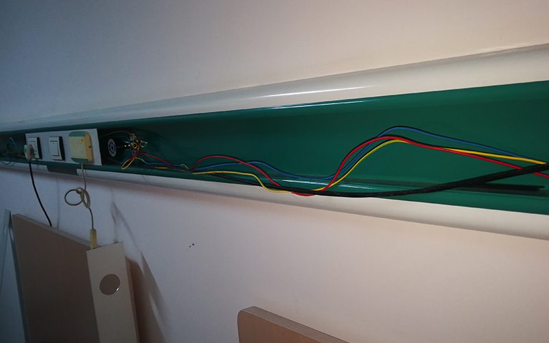 3、為了安裝簡(jiǎn)單美觀,一般每個(gè)房間的引入管都是從天花板內(nèi)的水平管道引出的,從引出端到進(jìn)入設(shè)備帶的部分管道外用鋁合金蓋覆蓋;鋁合金設(shè)備帶安裝了氧氣、氣體截止閥、吸引力、壓縮空氣管道和快速插座,快速插座一般離地1.4m;