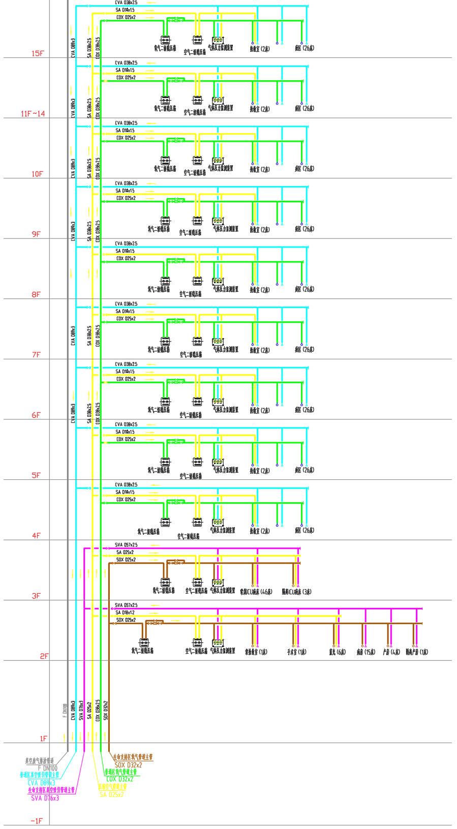 本項(xiàng)目為北京某三家醫(yī)院3#住院樓項(xiàng)目的醫(yī)用氣體設(shè)計(jì)。包括普通區(qū)氧氣管道系統(tǒng)、生命支持區(qū)氧氣管道系統(tǒng)、普通區(qū)真空吸引管道系統(tǒng)、生命支持區(qū)真空吸引系統(tǒng)、醫(yī)療壓縮空氣管道系統(tǒng)系統(tǒng)設(shè)計(jì)。普通區(qū)氧氣管路由院區(qū)液氧站提供、生命支持區(qū)氧氣由院區(qū)氧氣匯流排提供;真空吸引系統(tǒng)由院區(qū)真空匯提供;醫(yī)療壓縮空氣系統(tǒng)由院區(qū)制氧站提供。